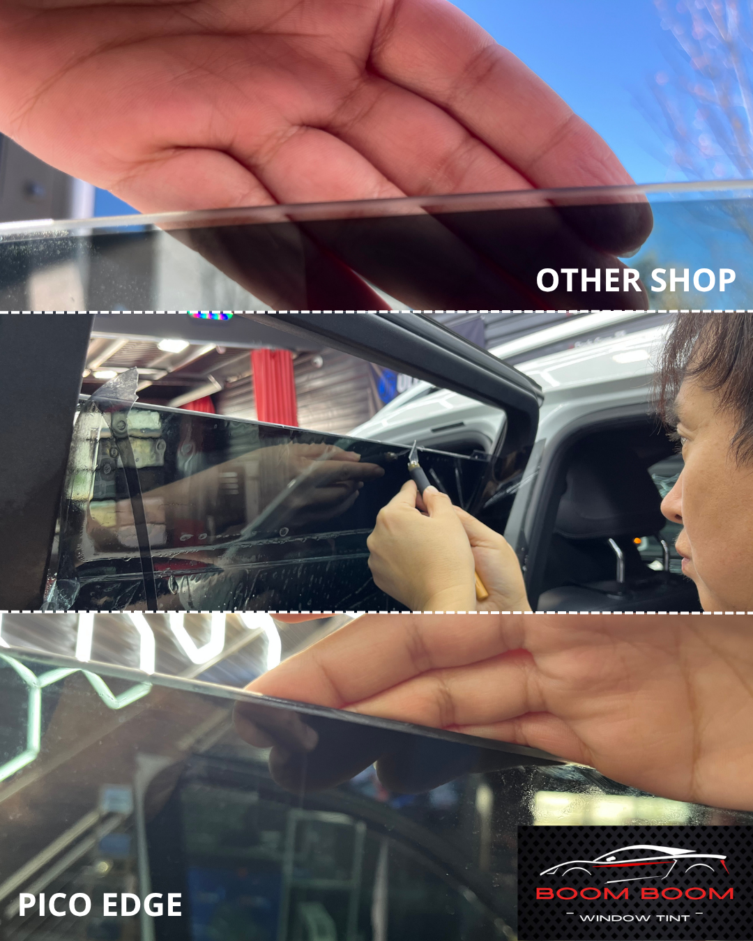 At GA Boom Boom Tint, our Ceramic Tint installations use the Pico Edge Method — a precision cutting technique that allows the film to sit perfectly along the edge of the glass.